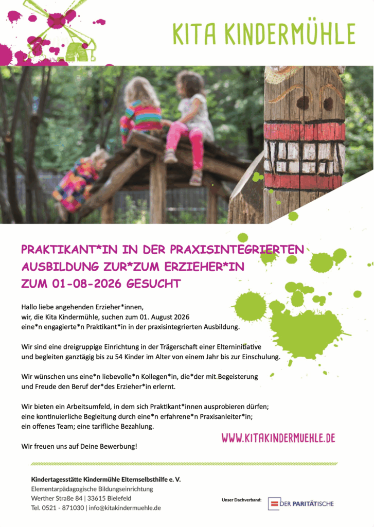 Darüber hinaus sind wir offen für Initiativbewerbungen. Diese gerne per E-Mail an info@kitakindermuehle.de